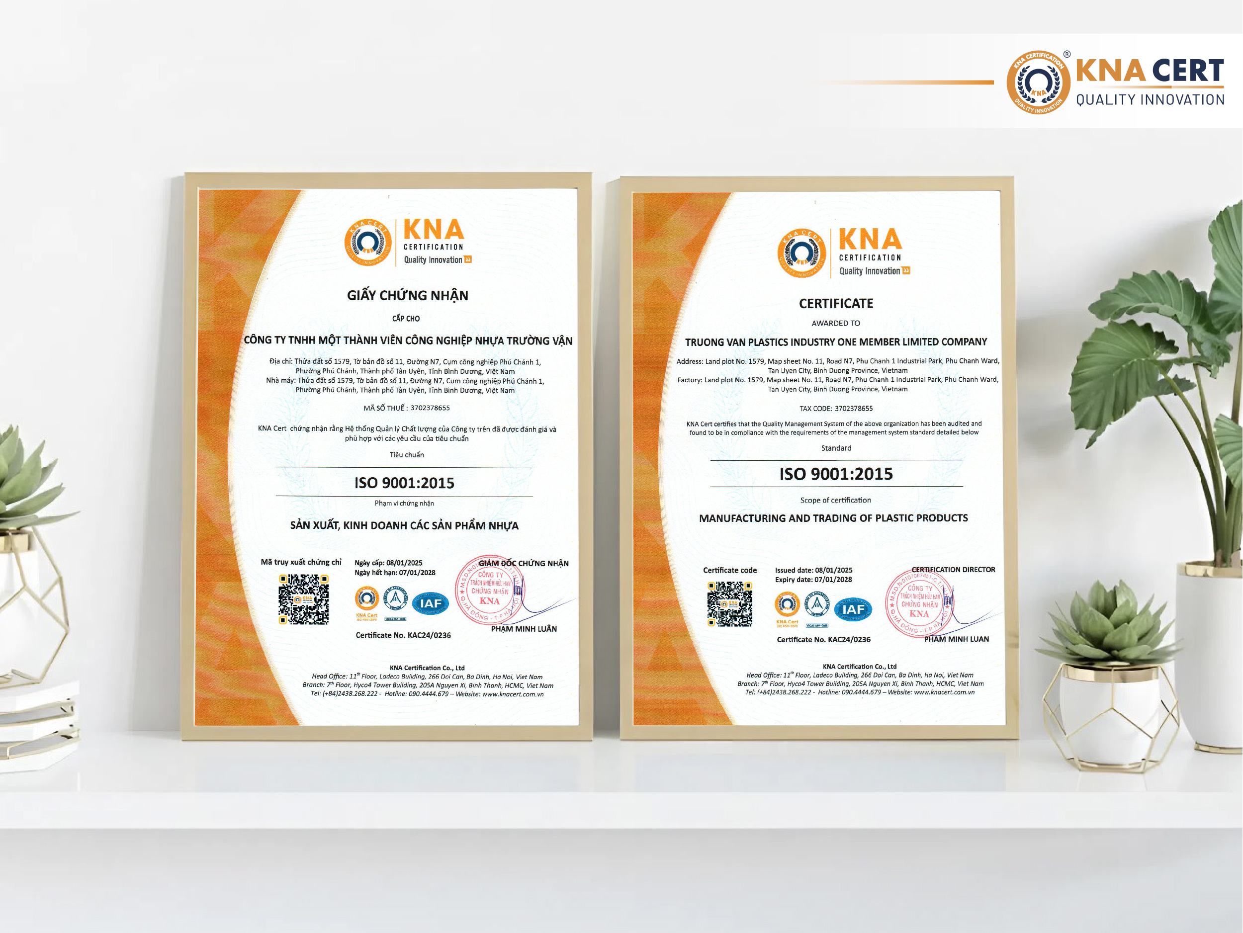Trong quá trình đánh giá và cấp chứng nhận ISO 9001:2015, Nhựa Trường Vận đã tin tưởng lựa chọn KNA CERT – tổ chức chứng nhận uy tín hàng đầu tại Việt Nam. Với kinh nghiệm sâu rộng và đội ngũ chuyên gia chất lượng, KNA CERT đã hỗ trợ doanh nghiệp xây dựng hệ thống quản lý hiệu quả, đáp ứng các tiêu chuẩn khắt khe của ISO 9001:2015.