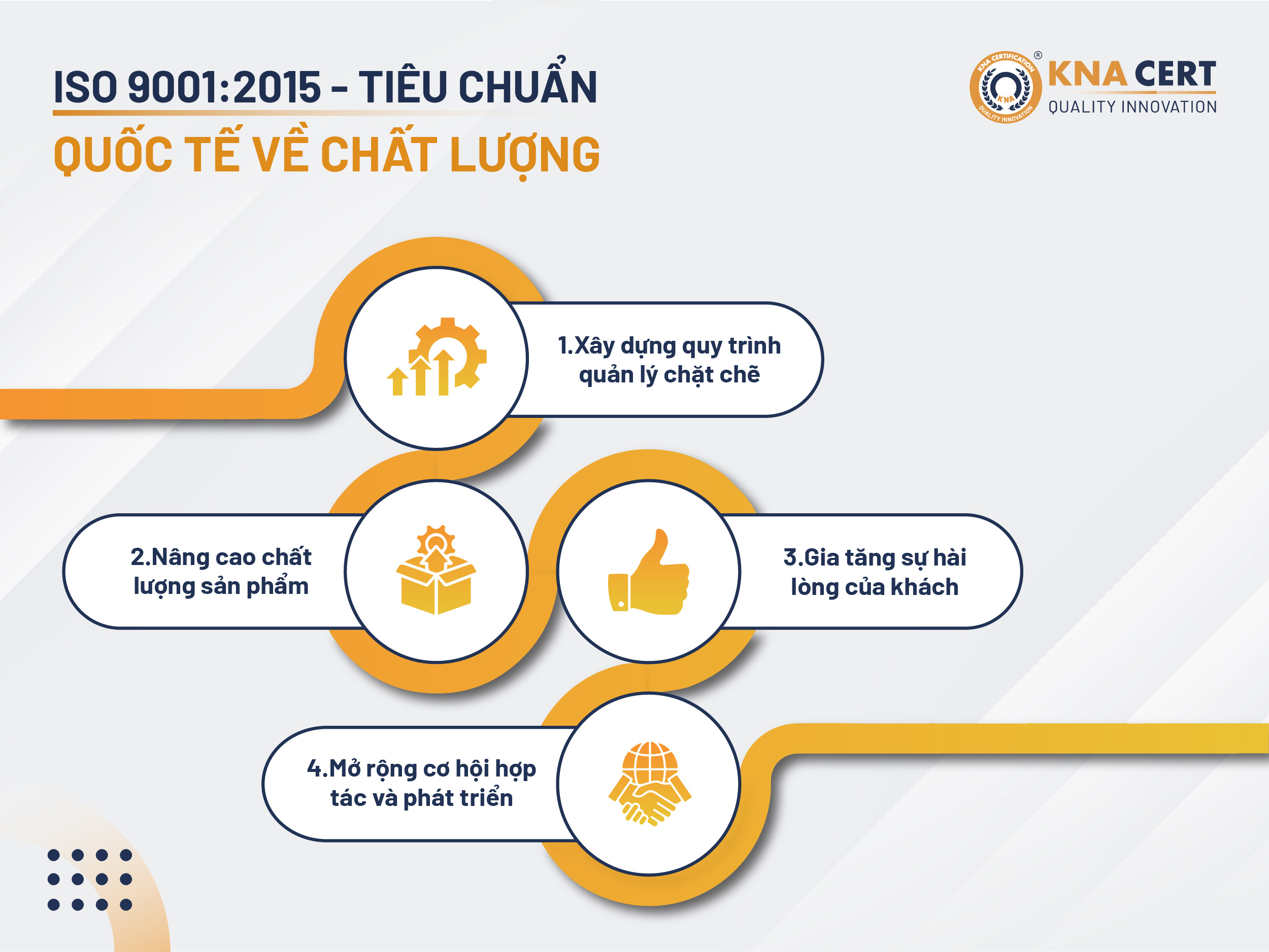ISO 9001:2015 là tiêu chuẩn quốc tế về Hệ thống Quản lý Chất lượng (QMS), được công nhận trên toàn cầu. Tiêu chuẩn này giúp doanh nghiệp: